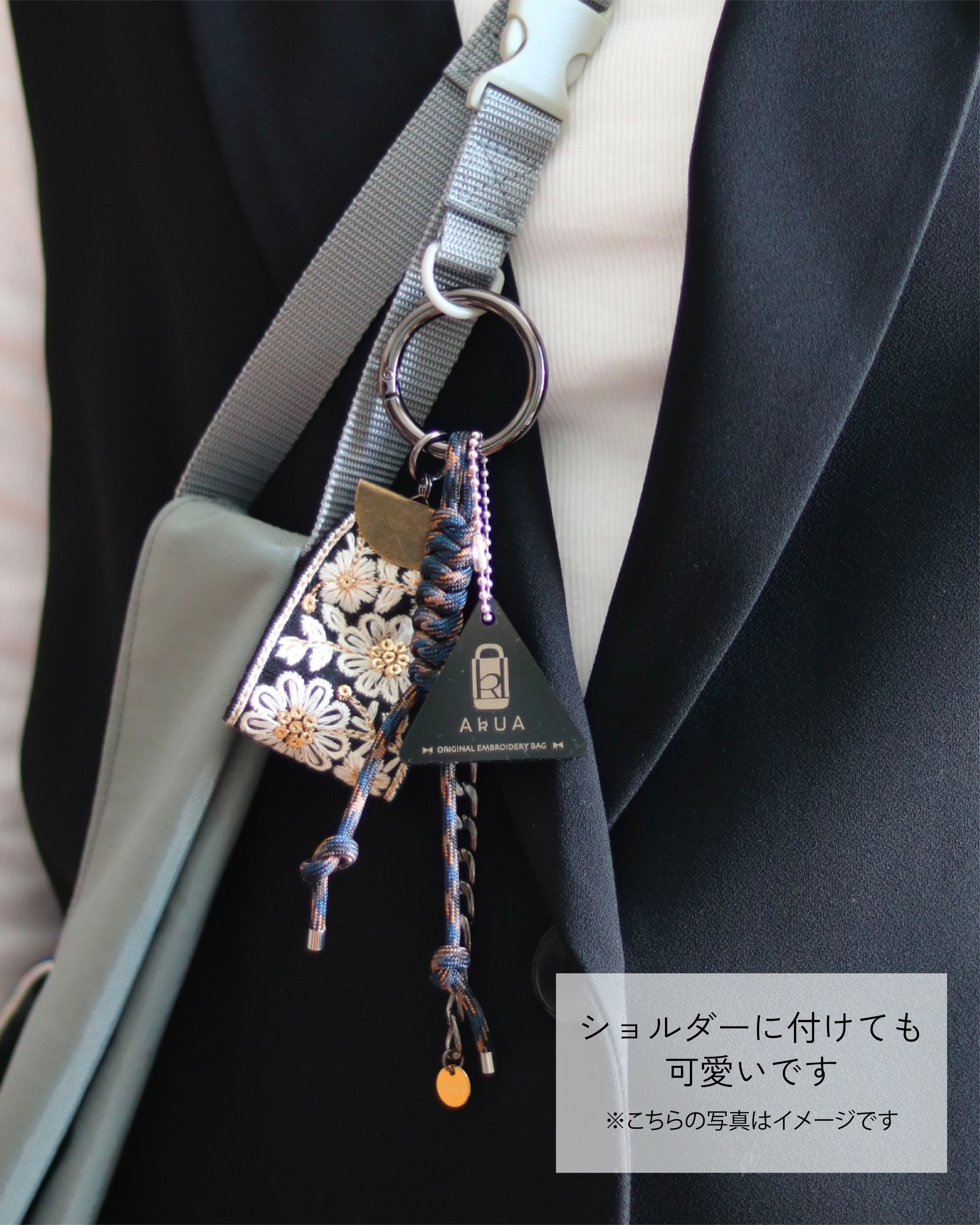 刺繍が施されたデザインが魅力的で、シンプルなバッグに華やかさをプラスします。