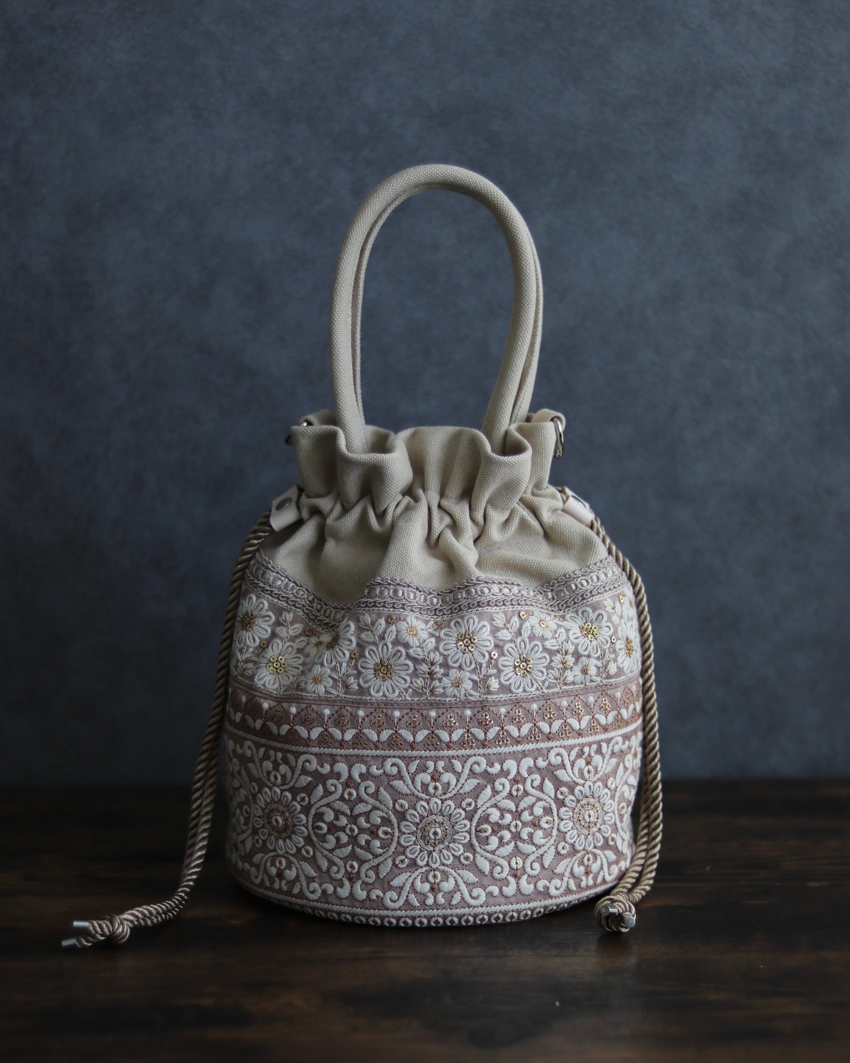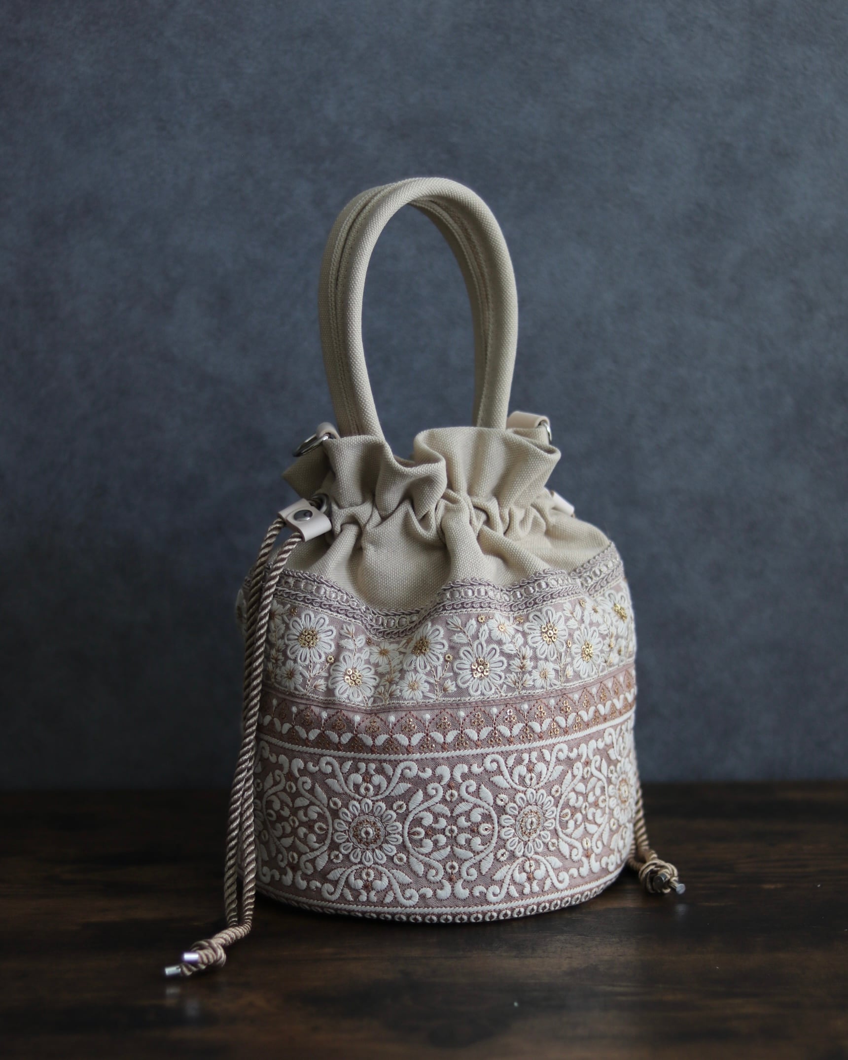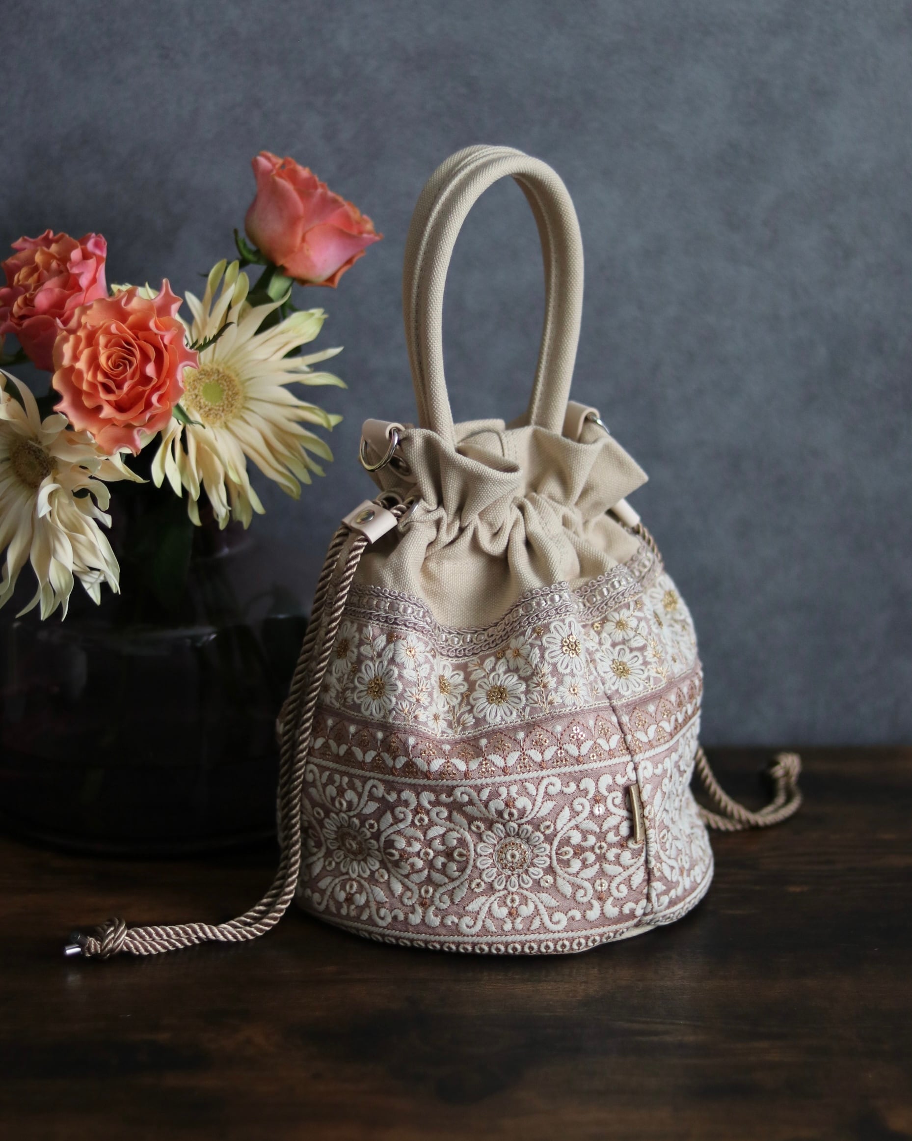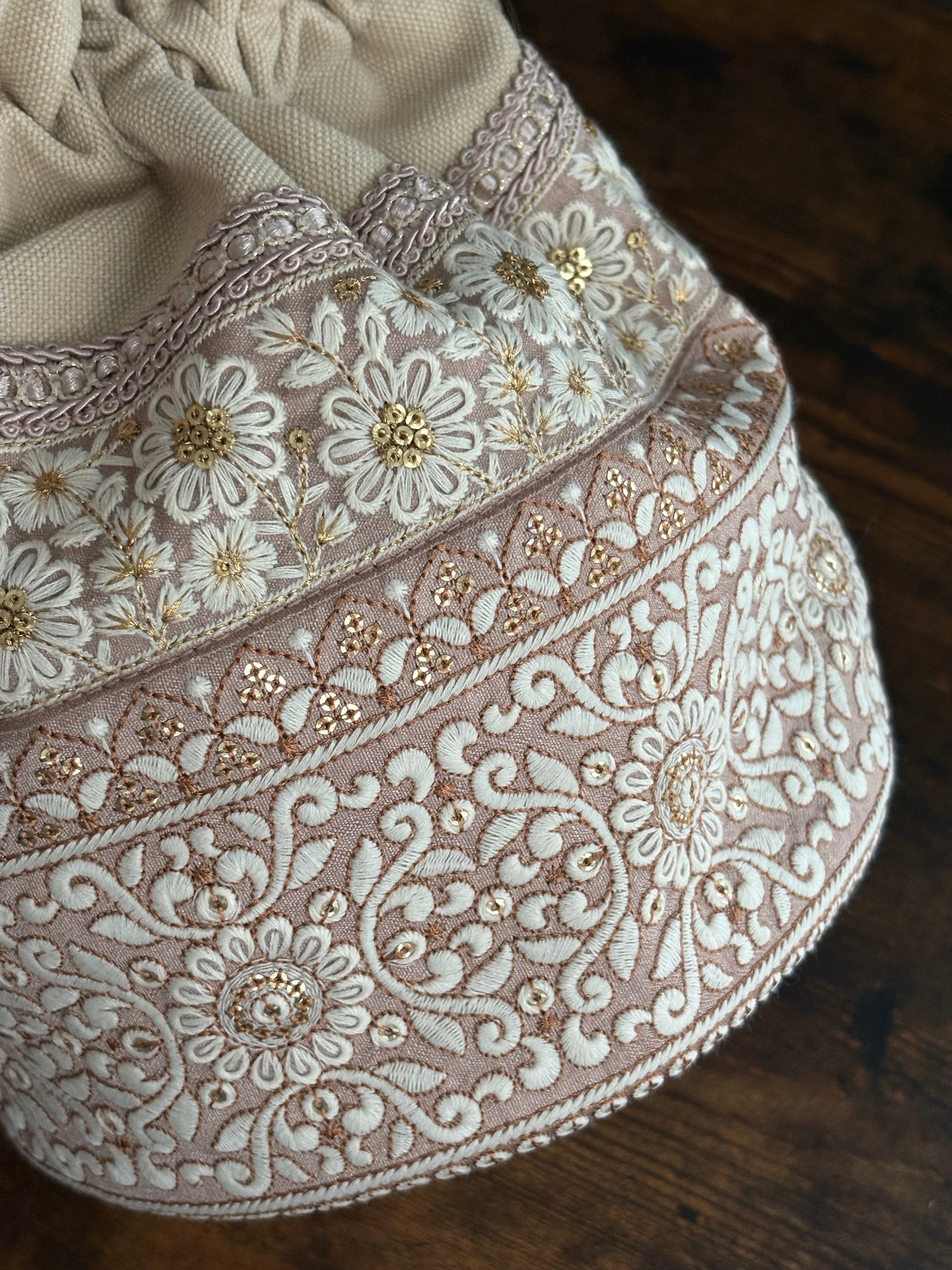 優しいピンクベージュに、華やかで繊細な刺繍。