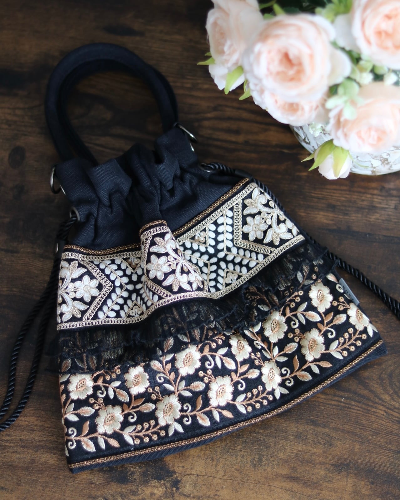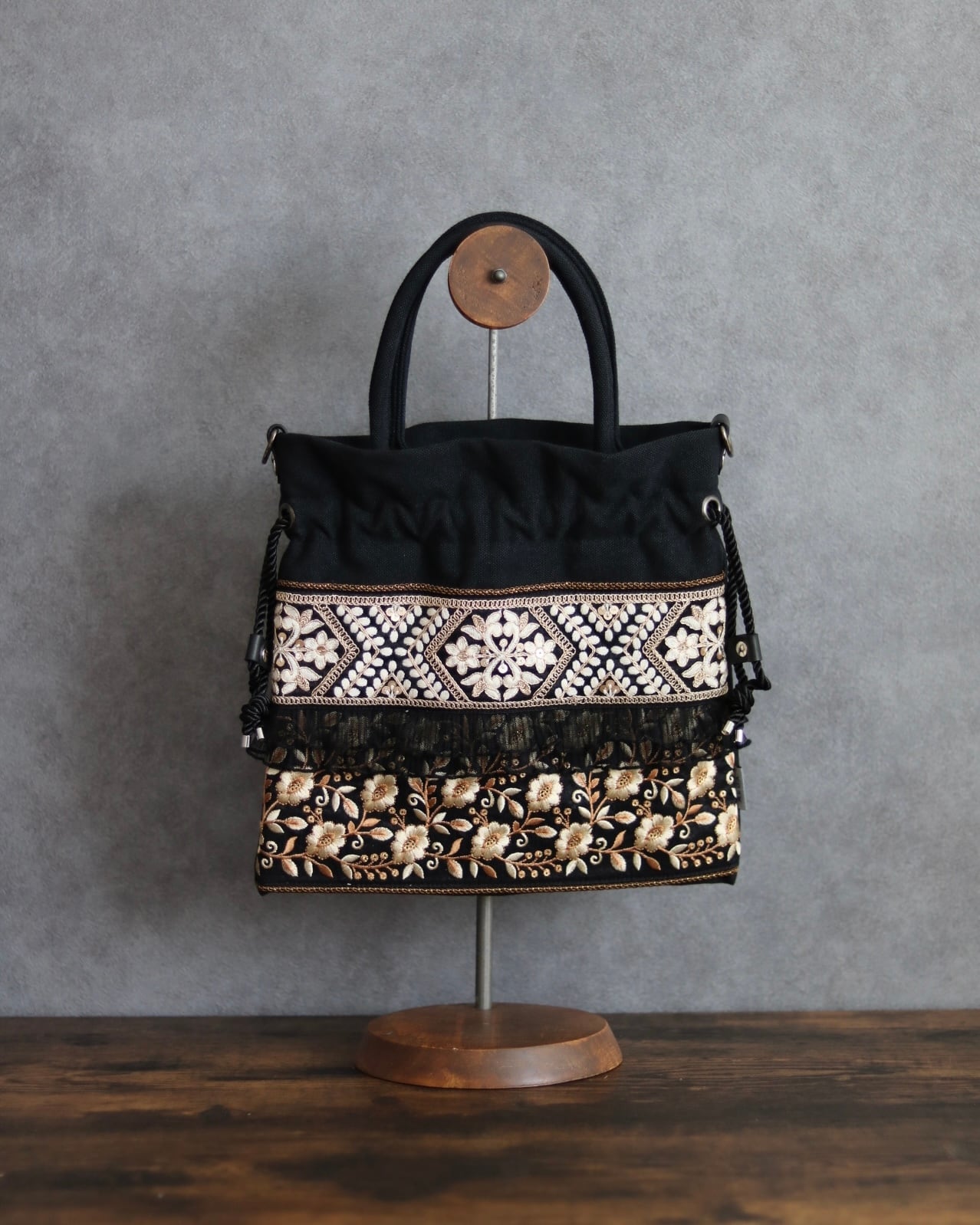 スクエア巾着バッグ ショルダー付き(ブラック)