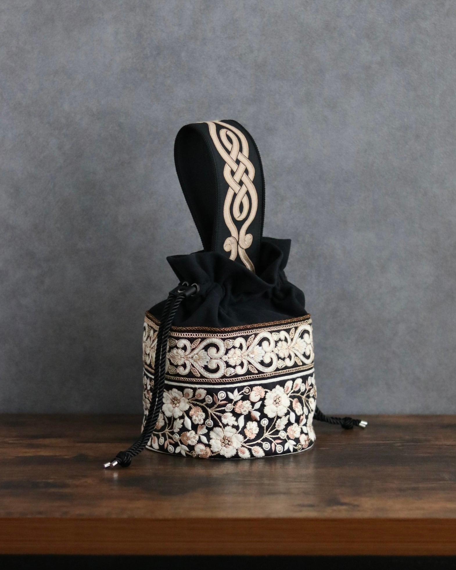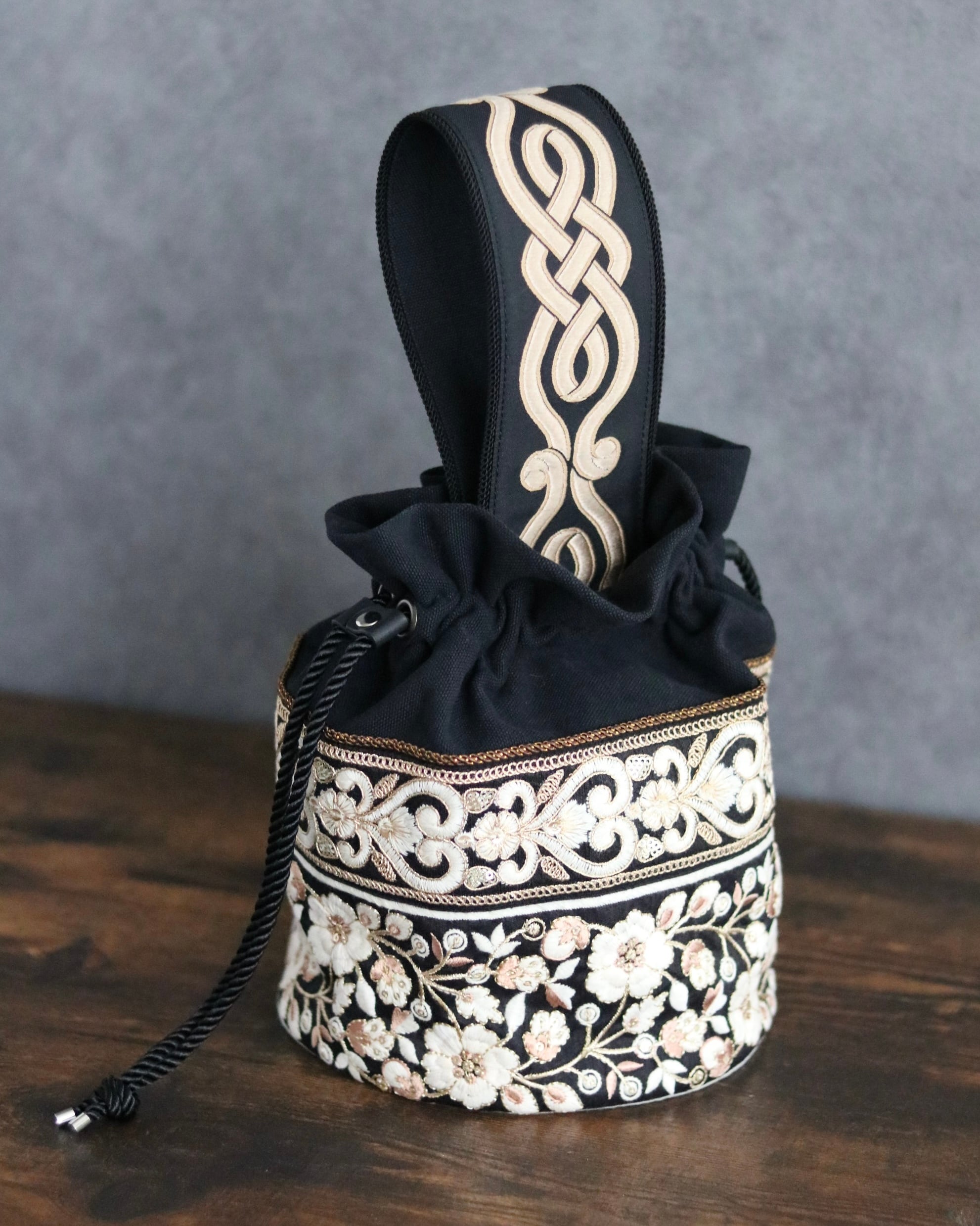 トルコリボンを使用した、個性的な持ち手のついた巾着バッグ