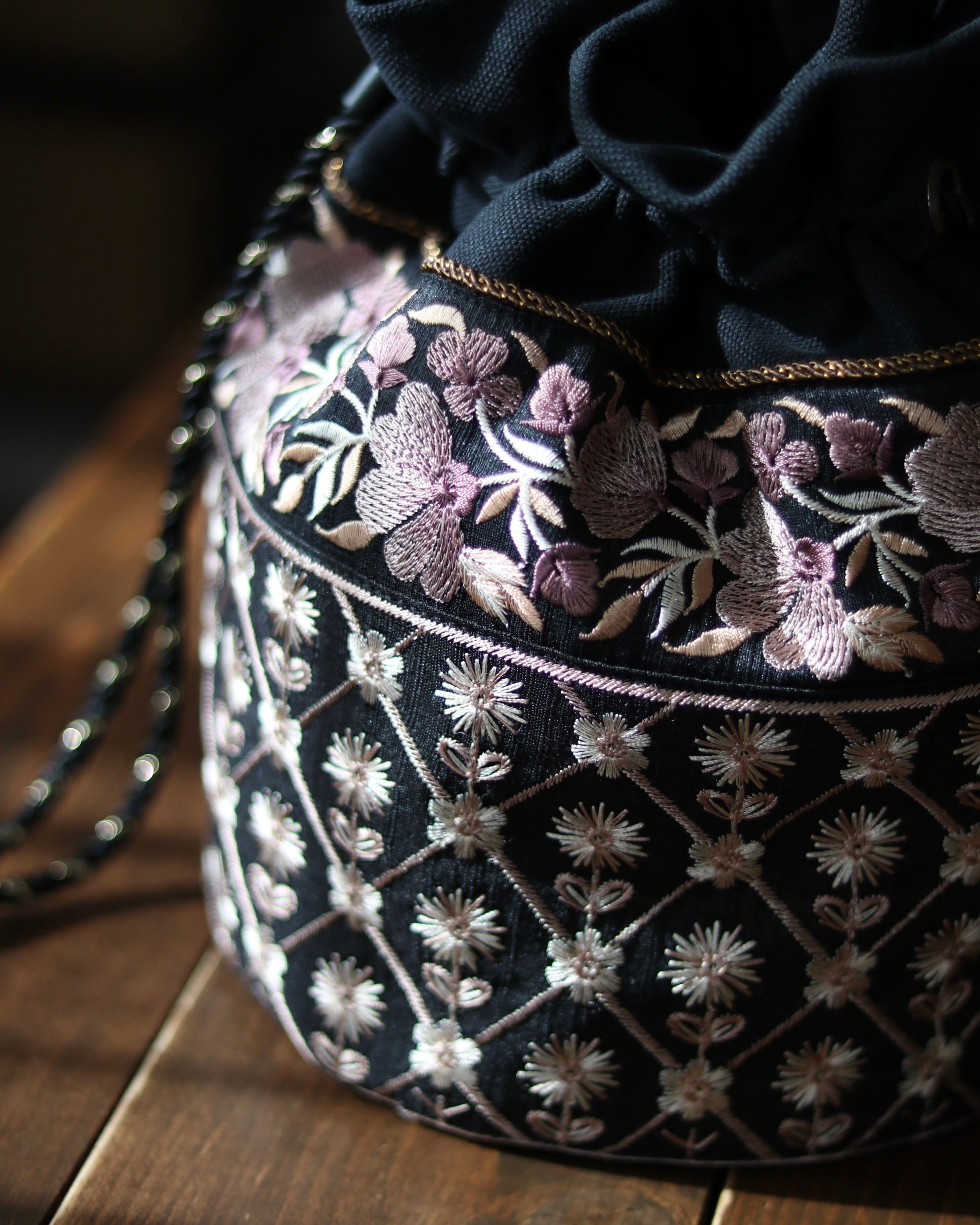 黒地に浮かぶホワイトとブロンズの糸が織りなすリズムは、