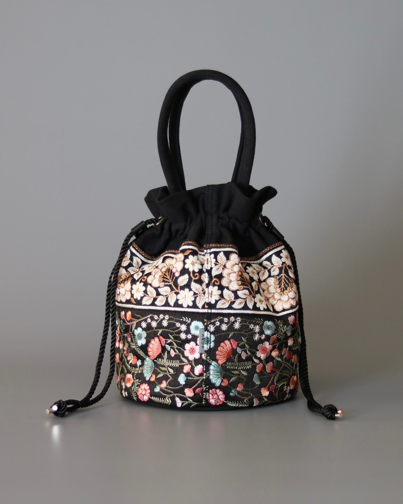 黒のキャンバスに、ピンクや白の刺繍が