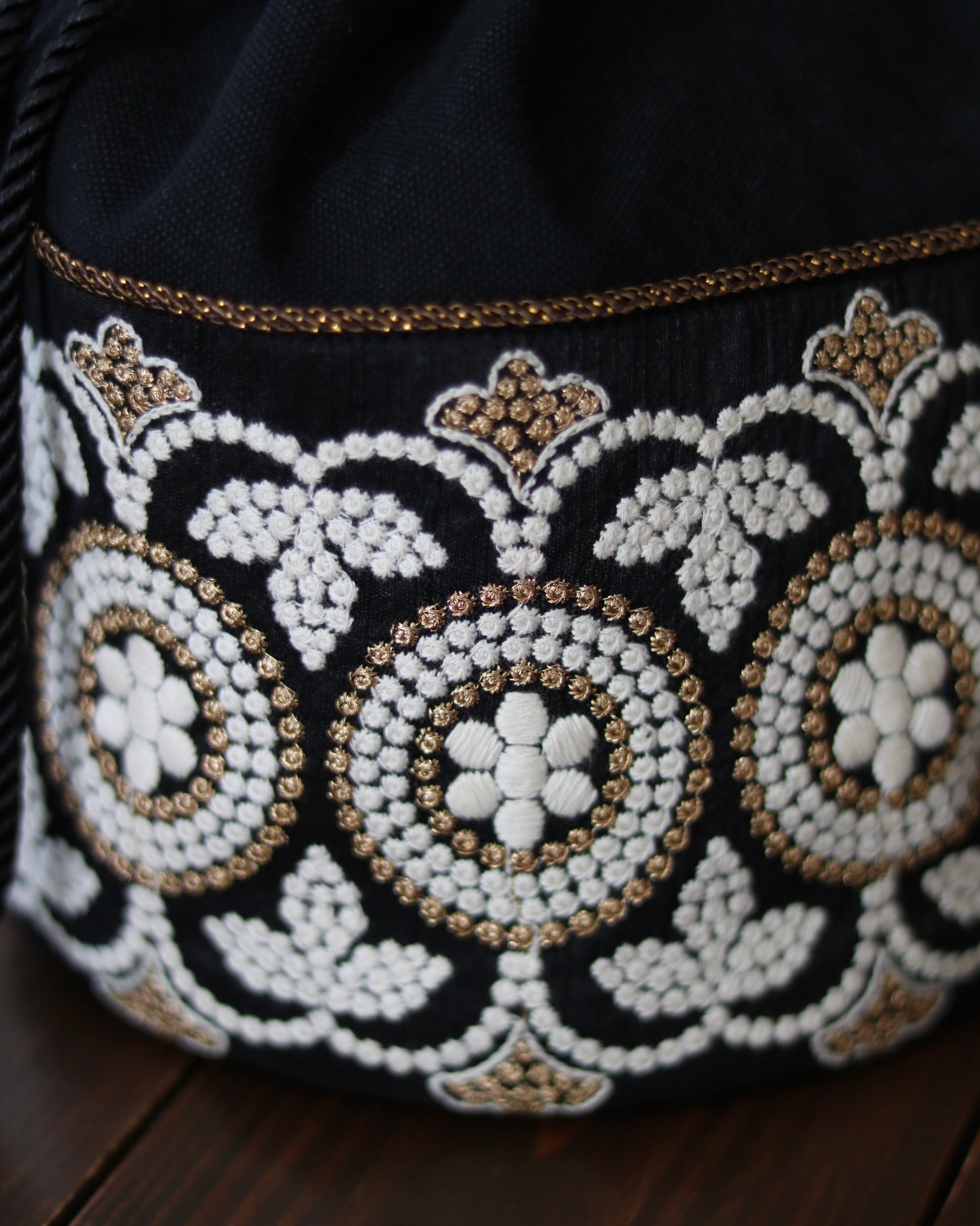 黒地に浮かぶホワイトとブロンズの糸が織りなすリズムは、
