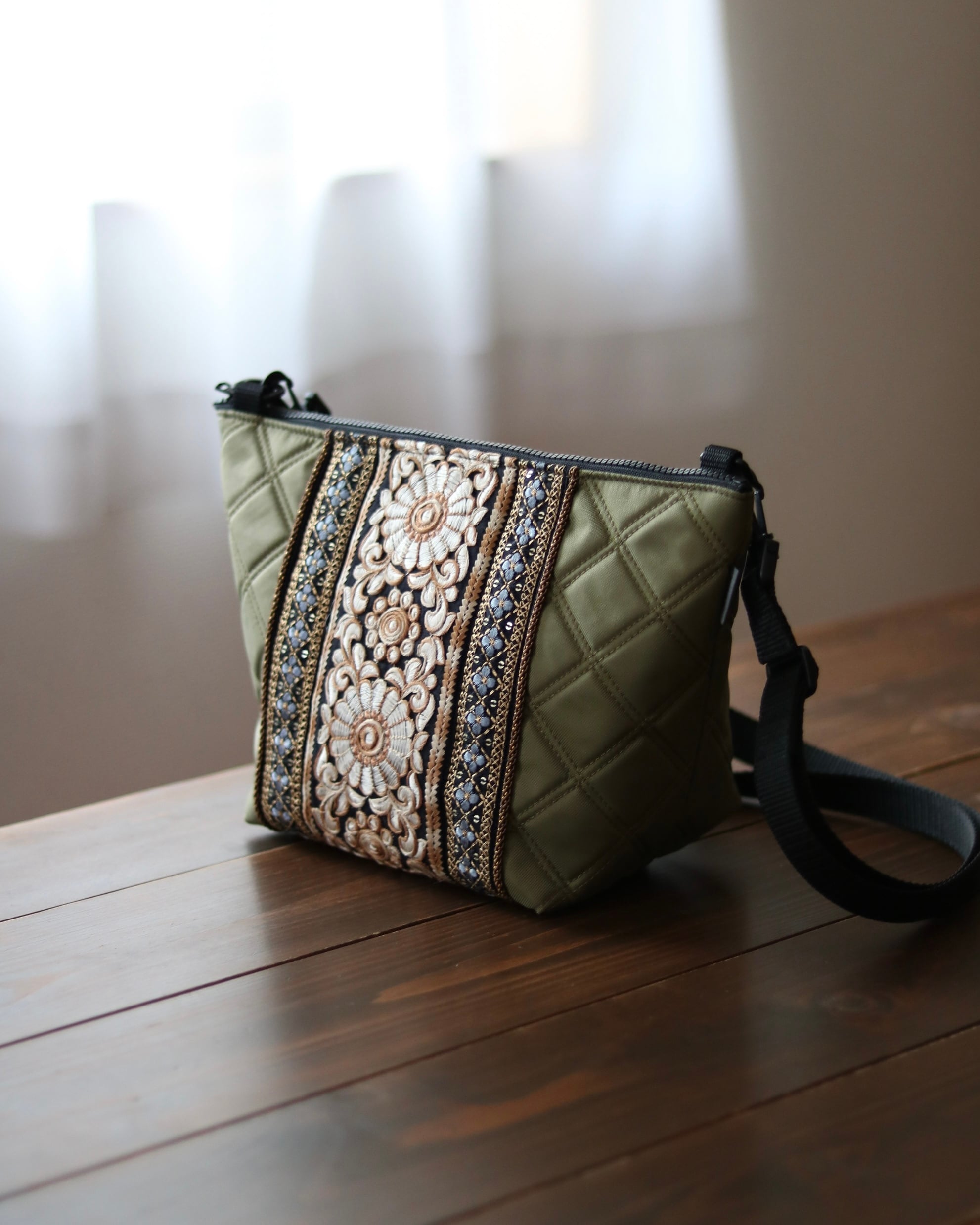 上品な刺繍リボンを装飾したショルダーバッグ。