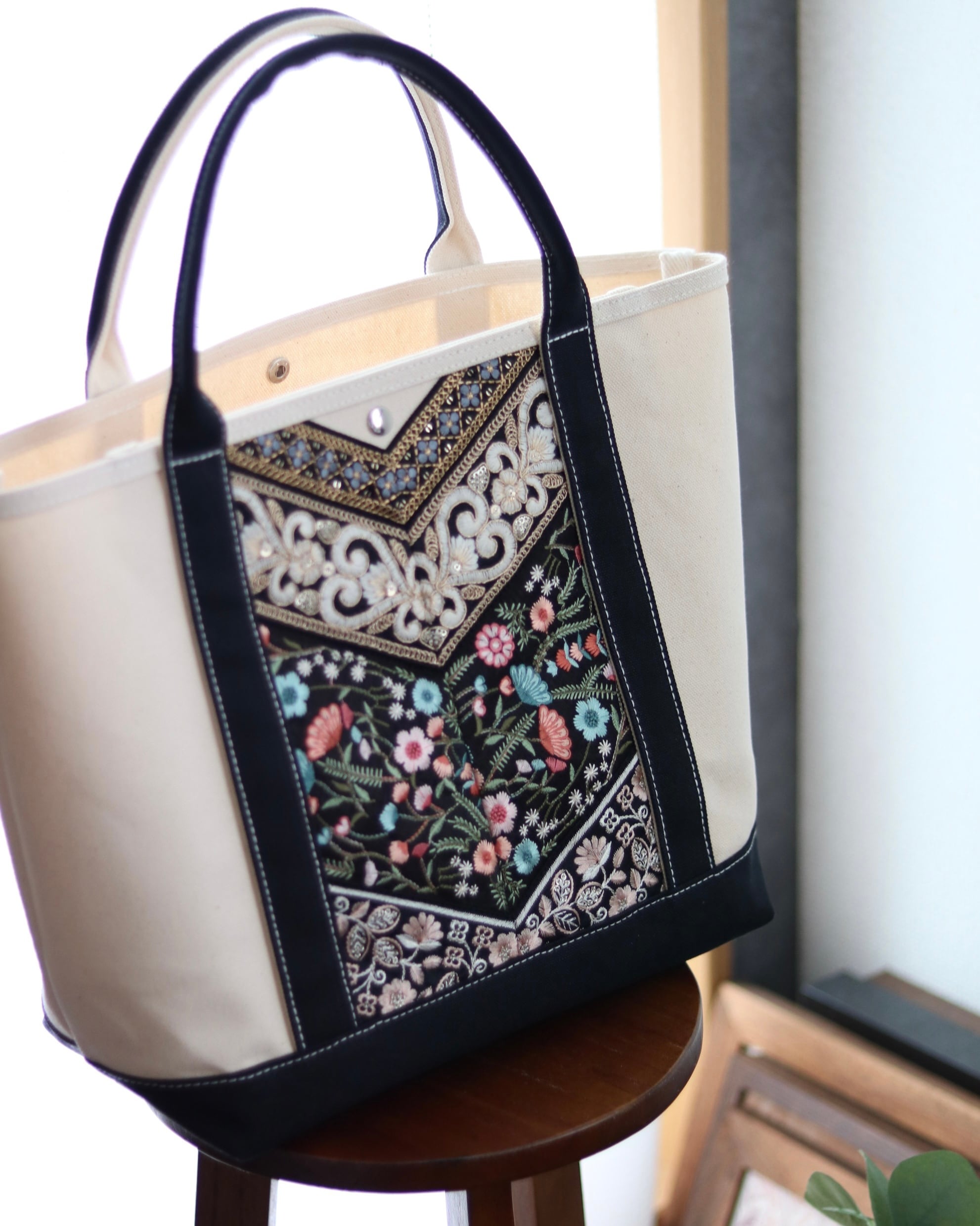 刺繍リボンを装飾デザインした、トートバッグ。